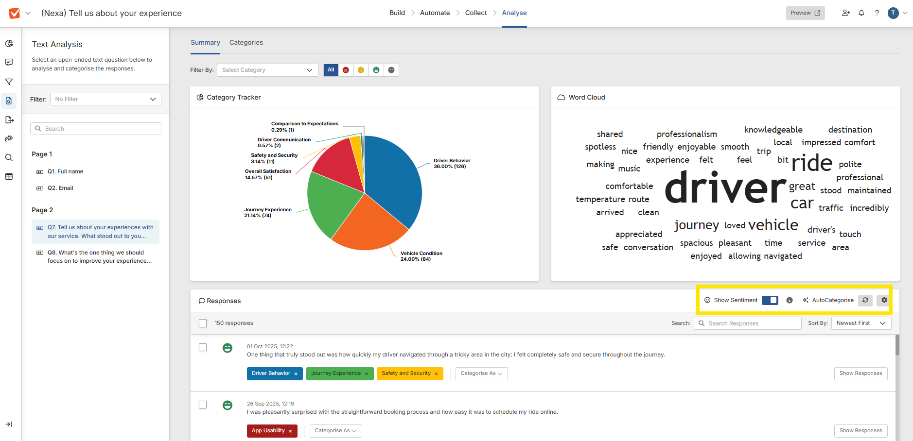As new responses are submitted to your survey, AutoCategorise will categorise them in real time so your Text Analysis is always up to date. If you have used Text Analysis charts in your Results View or Dashboards, this data will also be updated in real time - find out more about using Text Analysis & Sentiment Charts.