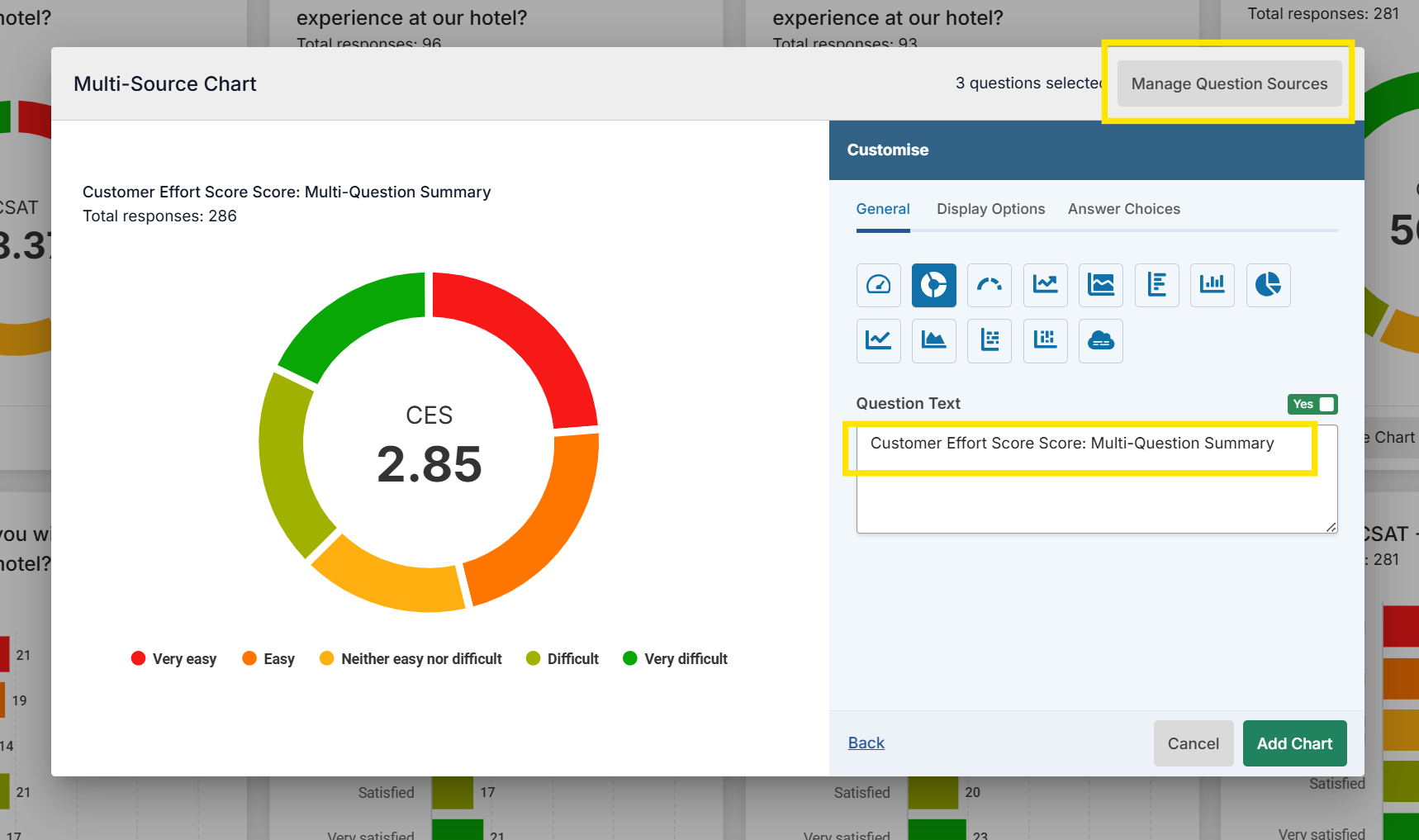 The same chart and display options are available depending on the question type. You can edit the Questions that are aggregated by "Manage Question Source" in the top right, which takes you back to the question list.