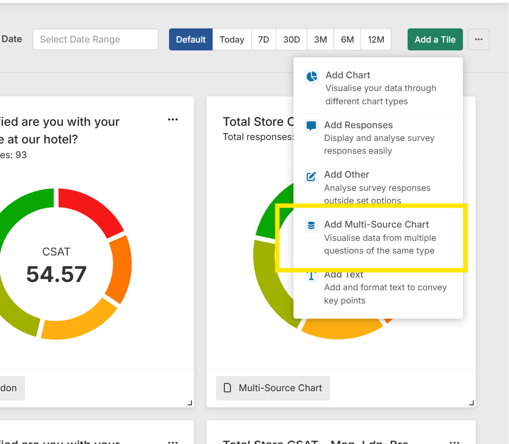 If you need to aggegrate data from multiple questions from different surveys or within the same survey, you can now do this by adding a "Multi-Source Chart" from the Dashboard "Add Tile" menu.