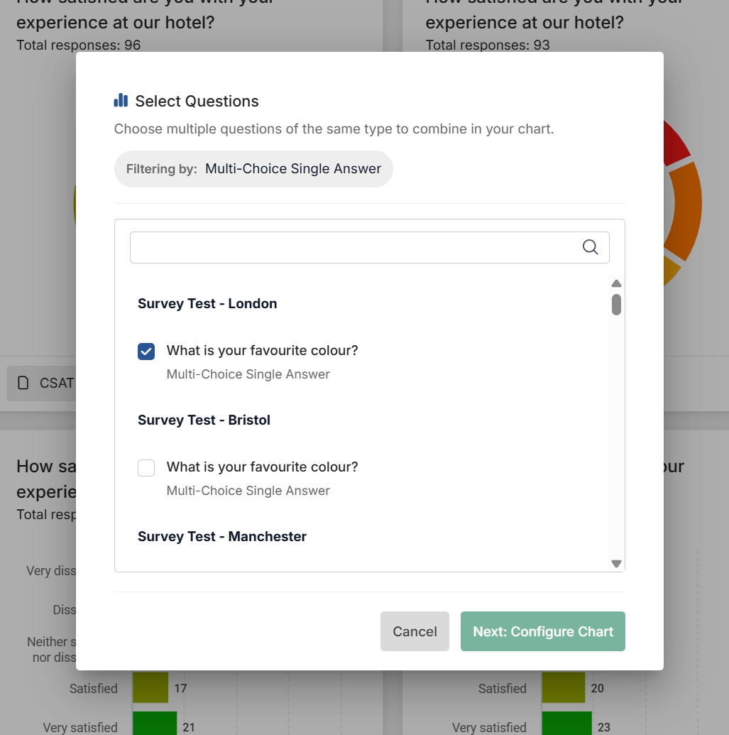 By choosing your first question, the list will filter down to the the same question types, making it easy to select which questions you want to aggegrate.
