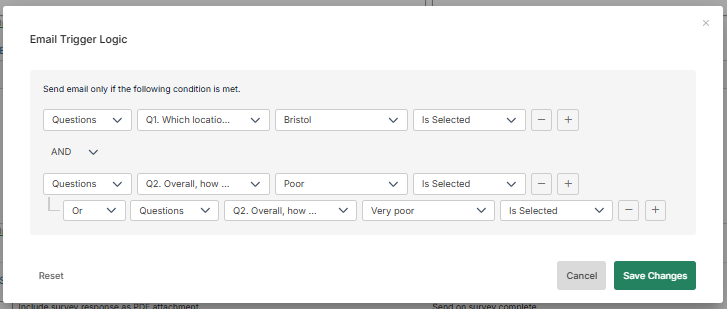 In the above example, we've set up an email that will only send to people who visited Bristol, and said their experience was "poor" or "very poor".